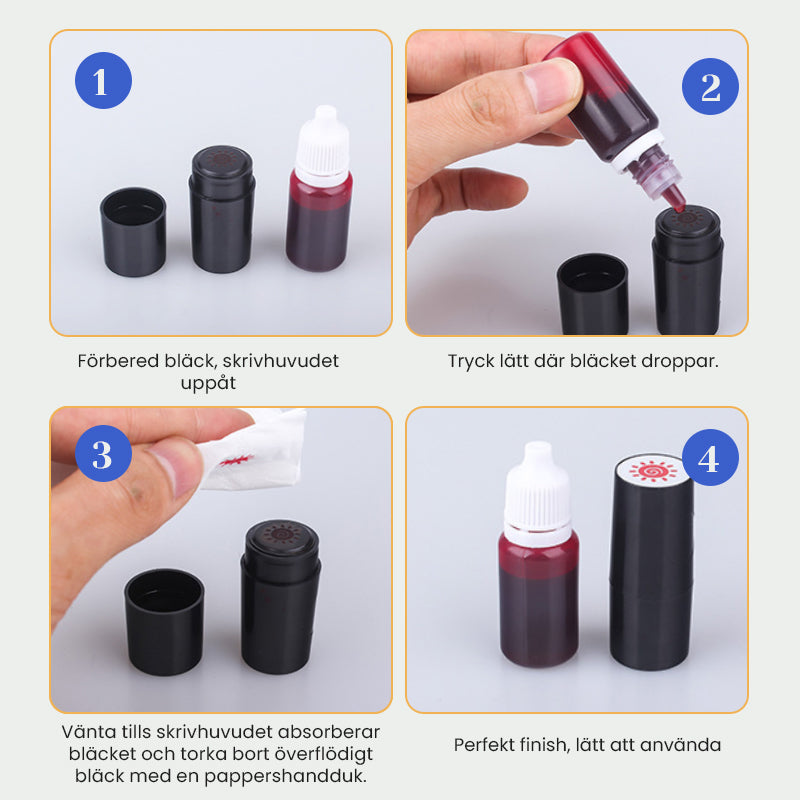 Damit Sie Ihren Stempel länger benutzen können, ist zusätzliche Tinte enthalten, die Sie bei Bedarf leicht nachfüllen können.